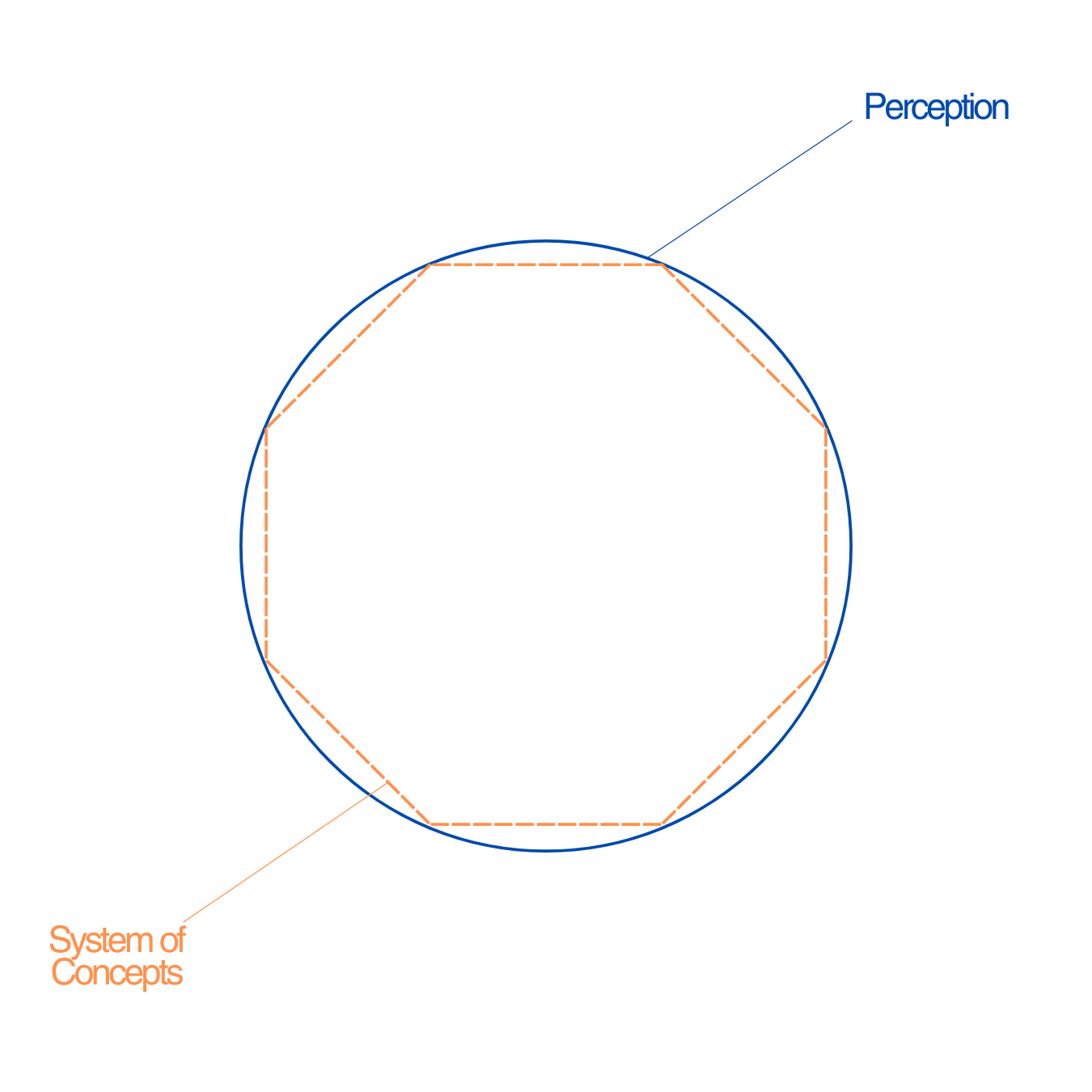 The perfect circle is perception—boundless, infinite, with neither a beginning nor an end—a continuum. Meanwhile, the geometric shape with thousands of sides represents the structure of concepts we build, each side is one concept. It gives us the illusion of understanding the world around us by seemingly approaching the circle. No matter how hard we try (especially today), words, images, or a virtual reality model of a tree cannot replace the feeling of standing beneath one. However, it is through concepts that we typically navigate through life, they are necessary in our day-to-day. When there is a red light while driving, you need to understand the concept and stop if you don't want to crash. For that, we must recognize it as an element meant to communicate, not solely as an object of perception (aesthetic).